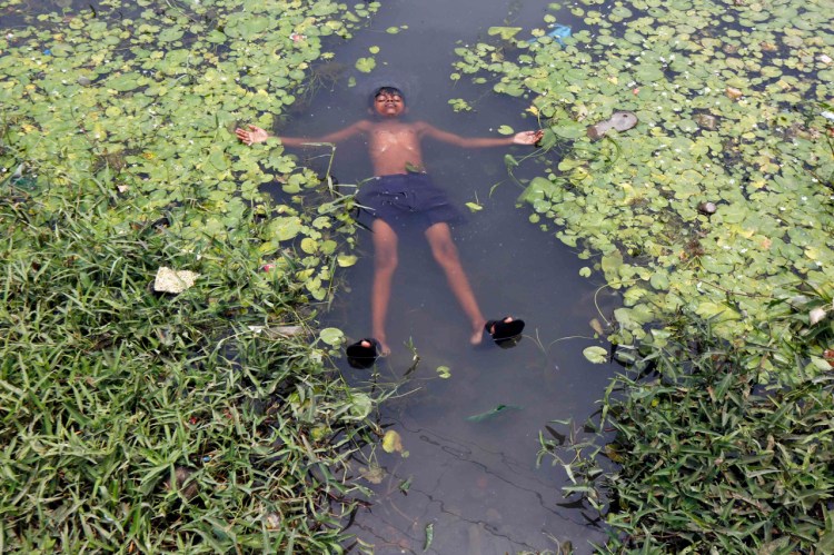 A boy floats in a pond to cool off on a hot summer day on the outskirts of Kolkata, India on April 28, 2016. (Rupak de Chowdhuri/Reuters)