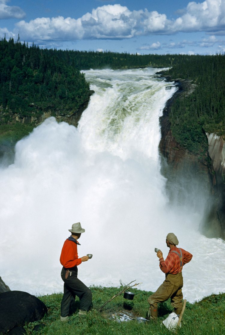 Hikers pause for coffee with a view of plunging Grand Falls. Labrador, Canada 1951