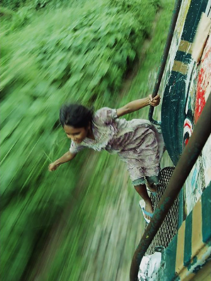 A Bangladeshi girl hangs on to the side of a train, Unknown Source