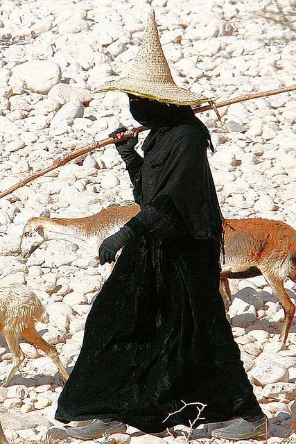 Veiled woman with high hat keeping goats – Haḍramawt, Yemen