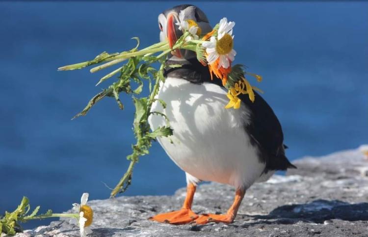 A puffin collecting flowers on Skelling Michael, Ireland
