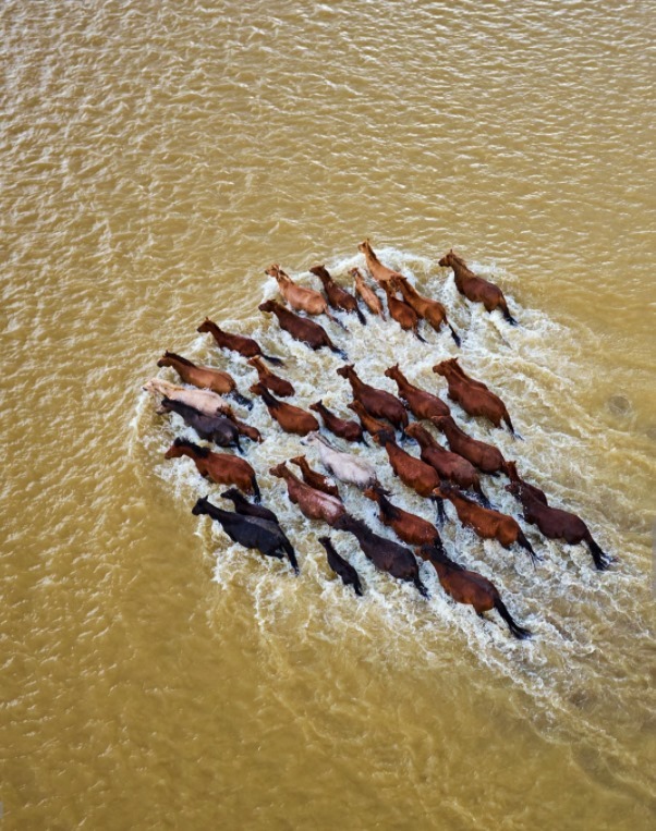 Mongolia, horses crossing the Orkhon