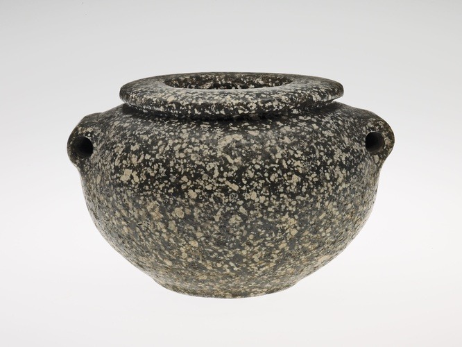 This jar was carved from very hard stone using a simple drill fitted with a copper tip. The small lug handles allowed for it to be suspended by cords. Vessels like this one were probably used for the storage of ointment or liquids.