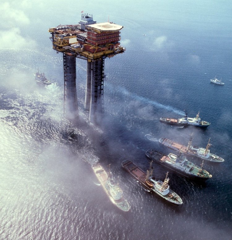Brent B, the first Brent platform to be commissioned, was built in Stavanger, Norway and towed out to its location on the field in August 1975. (Source: Shell)
