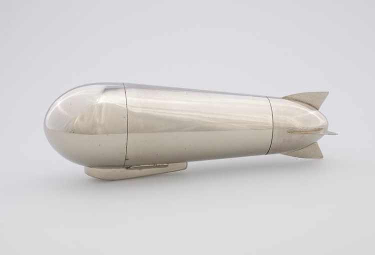 The streamlined form of the Zeppelin airship, served as the model for this most elegant of cocktail shakers. Everything required of the host was contained within the shaker including a flask, strainer/juicer, corkscrew, funnel and four graduated shot cups and spoons. When unscrewed, the tail section became a nut dish.