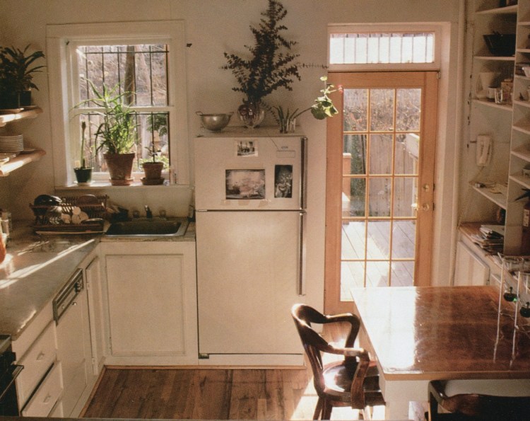 Opening up the kitchen. Open shelves and a glazed door to the backyard deck give the kitchen a bright, airy feel. Salvaged marble slabs cover the counters.