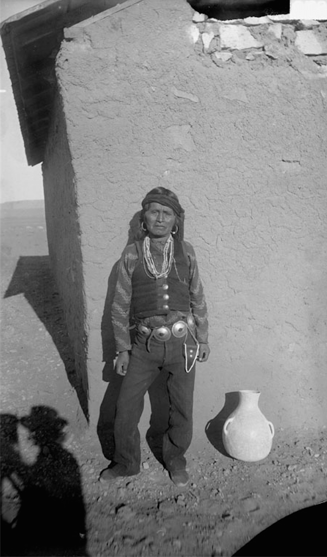 Hopi Tewa Man Concha Belt, Clay Pot Nearby – Mooney – 1893
