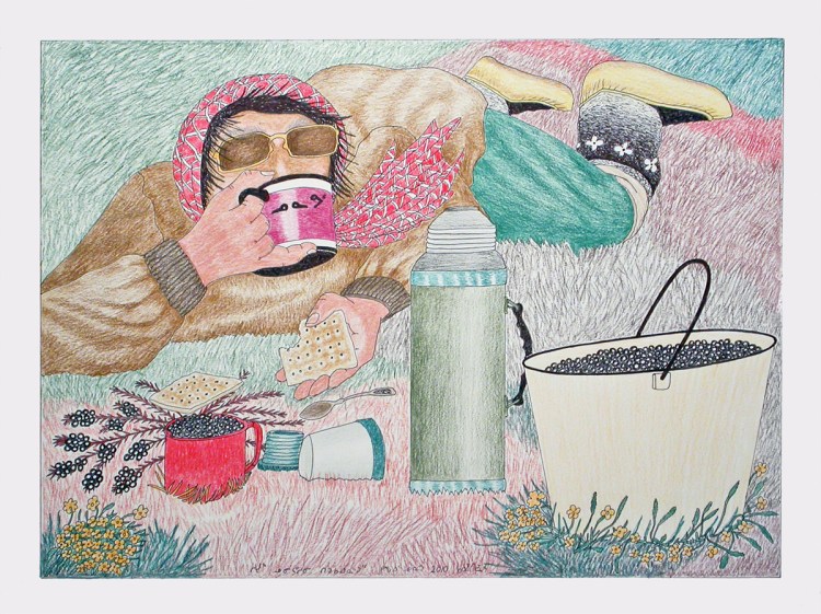 kananginak pootoogook, “untitled (shooyoo taking a tea break while berry picking),” 2010, colored pencil and ink on paper