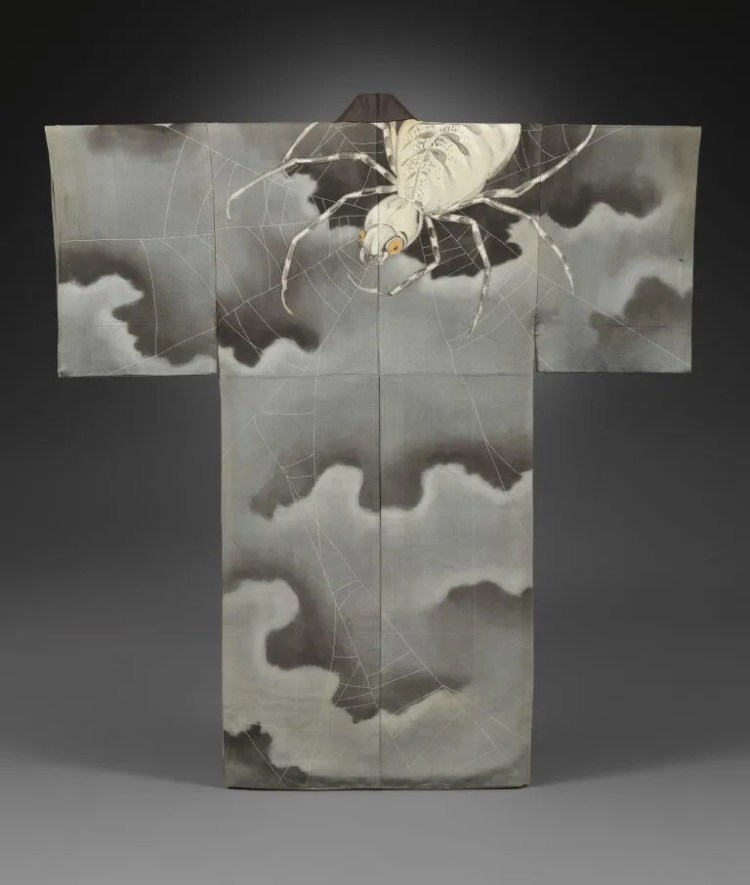 Man’s under-kimono (nagajuban) with spider and spiderweb. Taishō (1912–26) to Shōwa (1926–89) period, ca. 1920s-30s. Crepe silk (chirimen) with freehand paste-resist dyeing (yūzen). Promised gift of John C. Weber. Photo: Paul Lachenauer; courtesy of the Metropolitan Museum of Art.