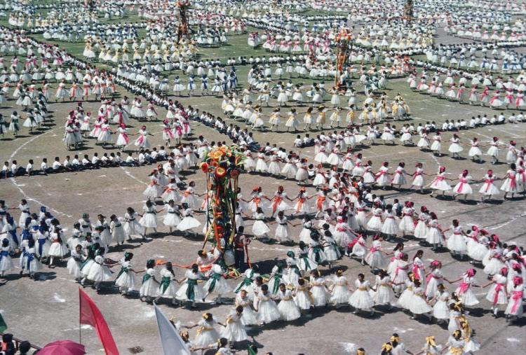 MEXICO. Puebla, 1962. Thousands of children dance in Mexico’s version of the May pole in celebration of Cinco de Mayo, the national holiday recognizing the victory of the Mexican army over the French at the Battle of Puebla. Photographer: Burt Glinn