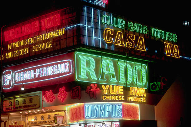 Neon signs glow over Nathan Road, a main shopping and entertainment district in Kowloon. Hong Kong, New Territories, British Crown Colony.