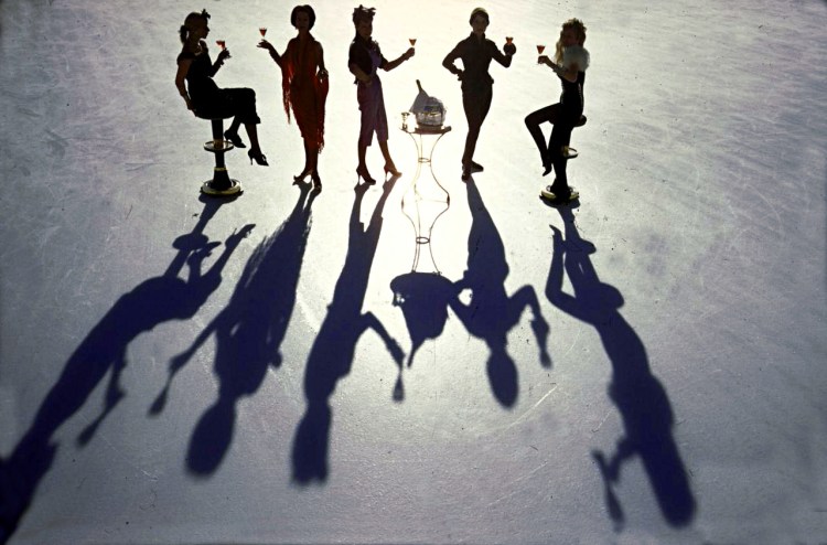 Women modeling apres-ski fashions designed by Fred Spillman cast long shadows on the Palace Hotel’s ice rink. St. Moritz, Switzerland.