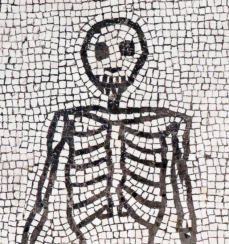 Detail of a Roman mosaic of a grinning skeleton holding two askoi (wine-jugs). Pompeii ~ ca.50 AD Museo Archeologico Nazionale di Napoli