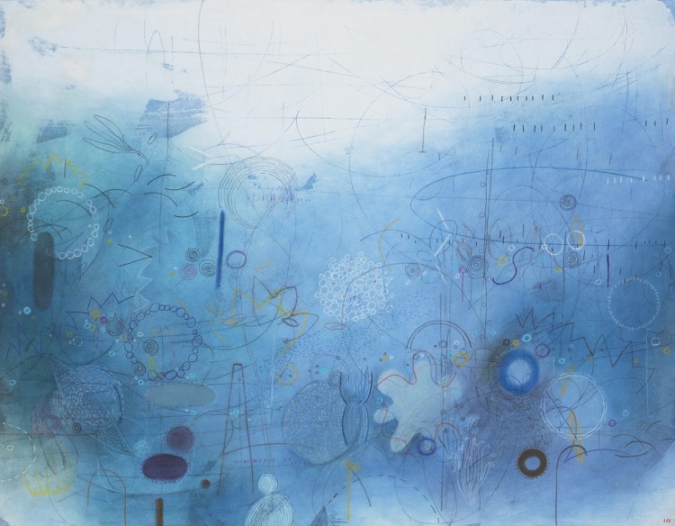 Emmi Whitehorse, False Indigo (#1583), 2021, mixed media on paper mounted on canvas, 39 ½ x 50 inches